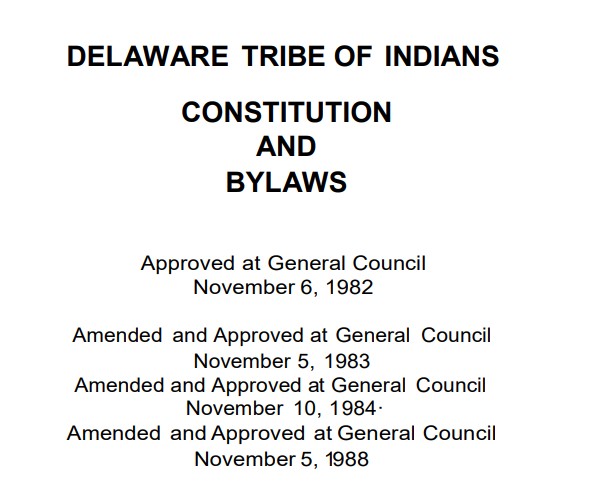 These are the tribe’s major administrative documents, including the tribal constitution, trust bylaws, and memorandum of agreement between the Delaware Tribe and Cherokee Nation following the reinstatement of federal recognition.